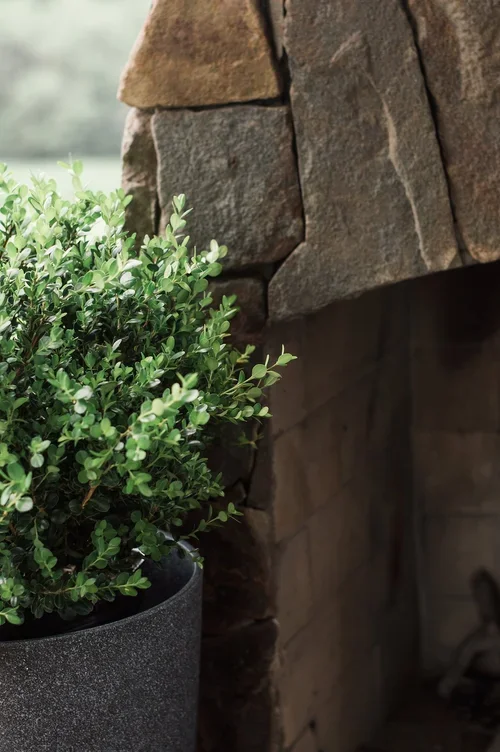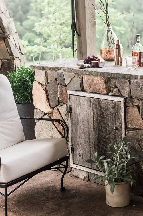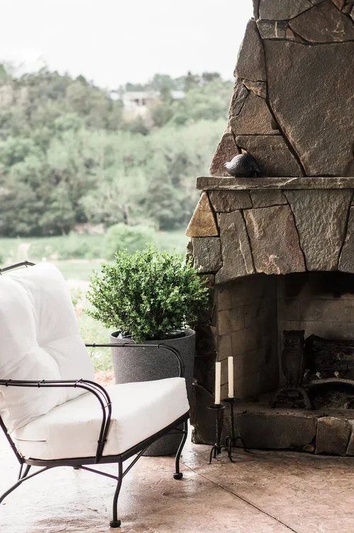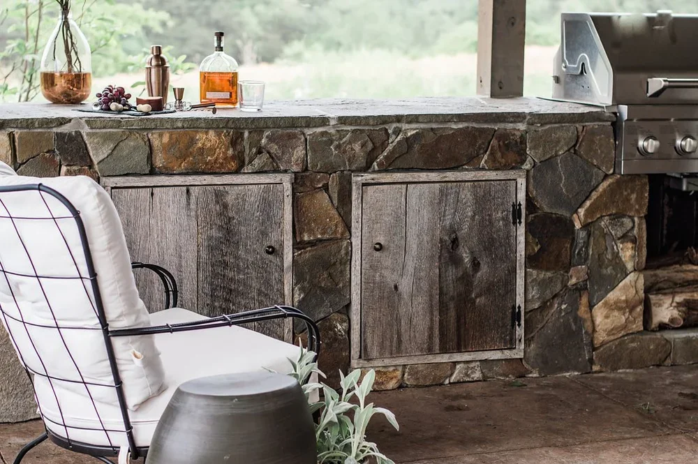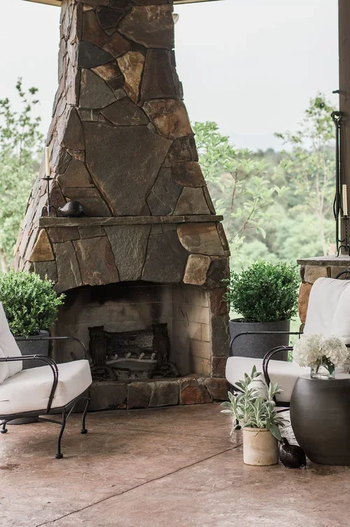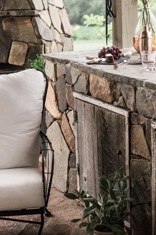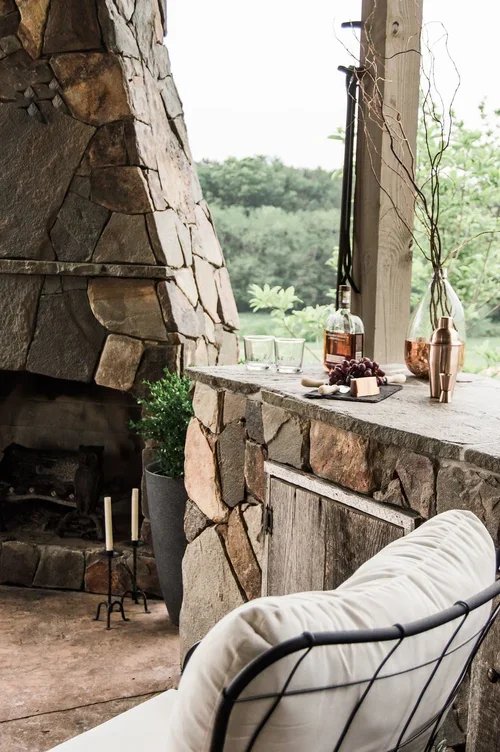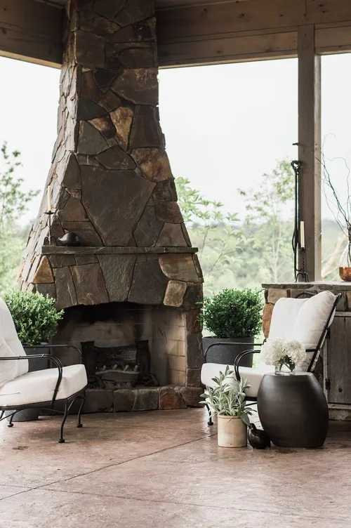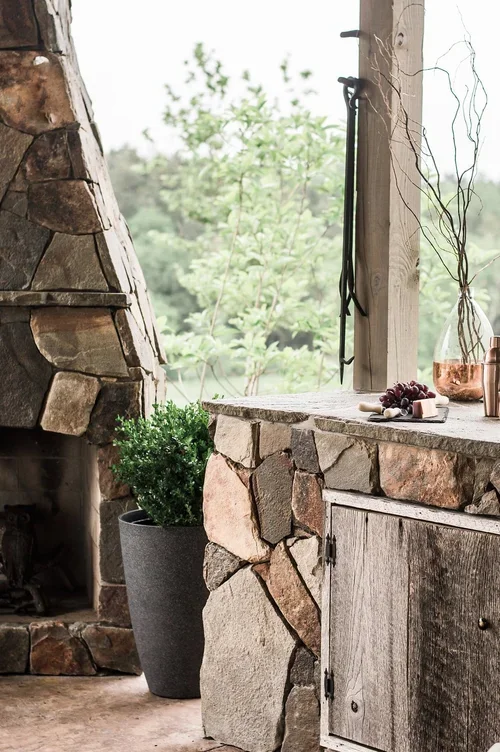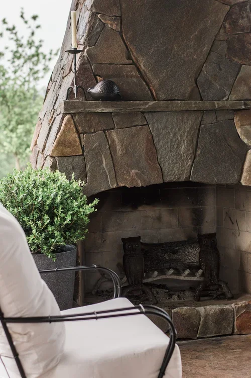 When clients entertain often, an outdoor kitchen with an open floor plan and large fireplace are in order. We paired a natural stone veneer with a modern fireplace shape to bring simple elegance to the space. A leftover stone slab became a custom dining table to finish this entertaining space.